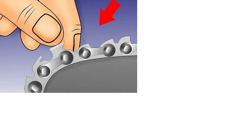 Bước 3: Kiểm tra xem các mắt xích có bị hư hỏng hay quá mòn so với tiêu chuẩn. Sau một thời gian sử dụng, mắt xích có thể bị sứt mẻ, gãy hoặc uốn cong, làm nguy hiểm đến sử dụng. Để kiểm tra độ mòn vượt quá tiêu chuẩn và cần thay thế chúng ta sử dụng quy tắc ngón trái như hình, chiều dài tối thiểu của răng so với ngón tay cái là 0,6cm. Nếu nhỏ hơn con số này, xích có thể bị đứt ra khỏi lam và rất nguy hiểm cho người sử dụng và cả những người xung quanh.