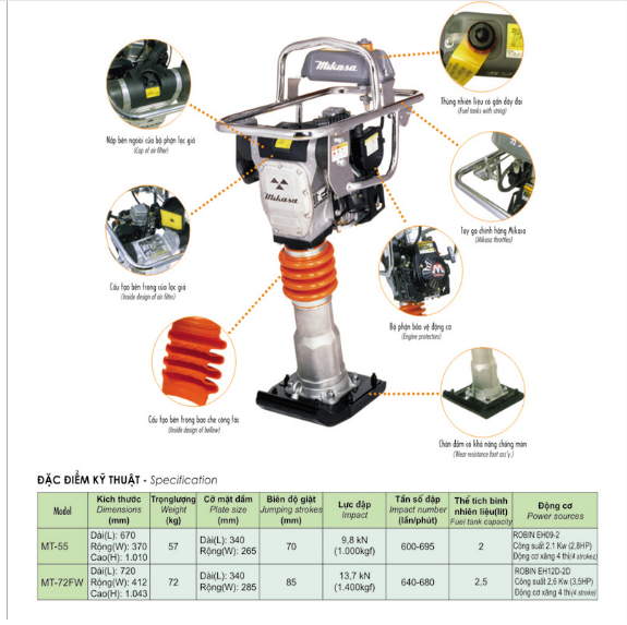 Dòng sản phẩm của đầm cóc mang thương hiệu mikasa, máy đầm cóc chạy xăng dùng động cơ robin , máy đầm bàn , máy lu mini kéo tay.
