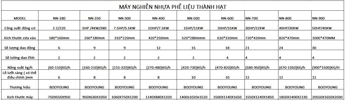 Đa Dạng Công Suất: BOOYOUNG cung cấp nhiều model máy nghiền nhựa với các mức công suất khác nhau (từ vài trăm kg/giờ đến vài tấn/giờ), đáp ứng mọi nhu cầu từ các cơ sở nhỏ đến nhà máy quy mô lớn.