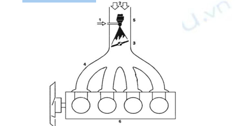 1-Vòi phun; 2- Không khí; 3- Bướm ga; 4-Ống hút tới các xylanh; 5-Ống hút chung; 6- Nắp xylanh b/ Loại phun xăng đa điểm: mỗi xylanh có một vòi phun bố trí gần xupap hút. Kỹ thuật phun xăng nhiều điểm cung cấp tỷ lệ xăng – không khí tốt hơn so với kiểu phun xăng một điểm. Bởi vì, trong kiểu phun xăng nhiều điểm, lượng xăng phun ra cho các xylanh động cơ được thống nhất, có nghĩa là tỷ lệ cung cấp nhiên liệu cho các xylanh hoàn toàn thống nhất. Ưu điểm này giúp tiết kiệm nhiên liệu, tăng hiệu suất động cơ xăng và giảm hơi độc hại trong khí thải.